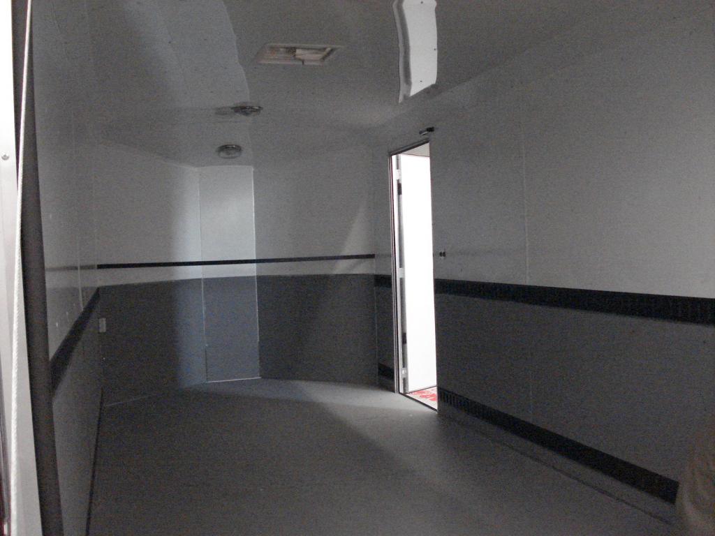 Pictured is a trailer finished with fibre-lite walls and white aluminum ceiling liner and e-track at 3 inches off the floor. Its very popular for those who like a brighter interior or for those who like to have the completed interior look.